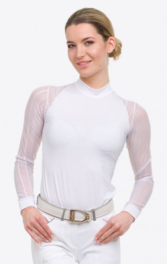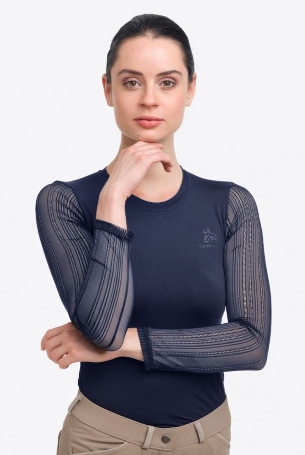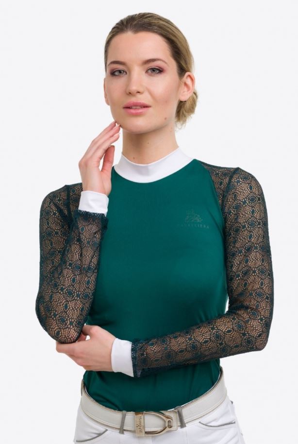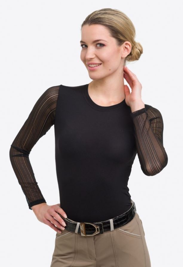 - Cavalliera long sleeve top for women, great for sporting in style. Made of two different fabrics: lightweight elastic lace sleeves that provides beautiful and feminine style, and a high performance technical fabric that offers lightweight, but durable comfort while training. Further design: tone-to-tone logo on the back.