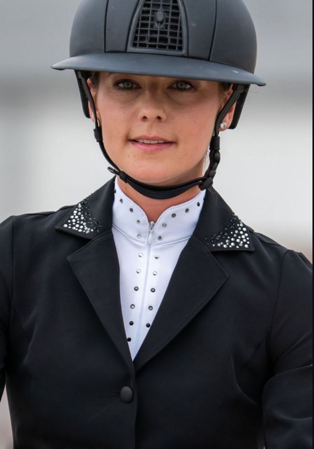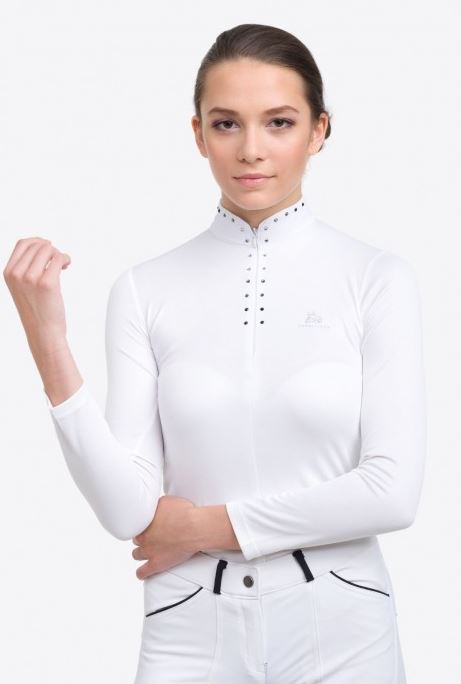 - Developed for active wear, this shirt provides all day comfort and style, it will keep you cool as the microfine yarns create a capillary action to channel sweat or water away. Featuring a modern standing collar design and black-jet hemitate-silver crystal decoration, elegance at the highest level. A high neck zip opening on the front makes this shirt perfect for competition with the collar being able to be worn fully closed or folded down like a polo. Available in short and long sleeve. Made of an extremely high quality wicking polyester to offer breathability and comfort.