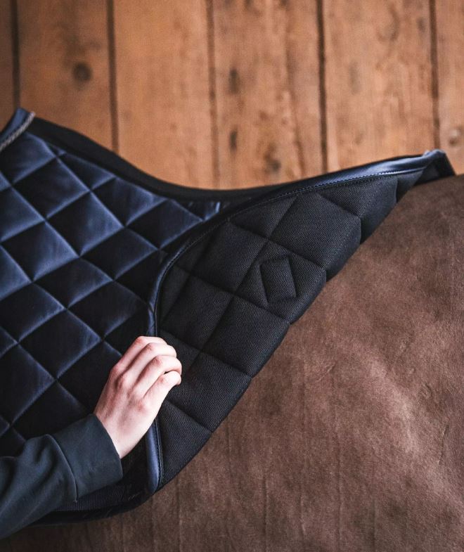 Saddle pad with a clean design and luxurious look. The surface layer is dirt and dust repellent and the inside layer is a quick-dry material with a breathable back panel.